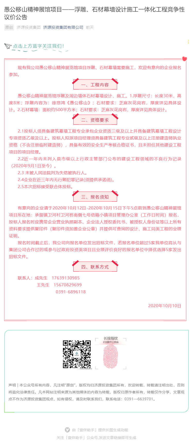 有意向的企業(yè)請于2020年10月12日-2020年10月15日下午5點(diǎn)前到愚公移山精神展館項目所在地:承留鎮(zhèn)衛(wèi)河村衛(wèi)河橋南側(cè)七號信箱小鎮(zhèn)項目管理辦公室(工作日時間)報名,投標(biāo)人報名時應(yīng)攜帶企業(yè)營業(yè)執(zhí)照副本、企業(yè)法人授權(quán)委托書、被授權(quán)人身份證等以上所有資料要求提供復(fù)印件(復(fù)印件須加蓋企業(yè)公章)并提供可查詢的設(shè)計、施工同類工程的業(yè)績證明。