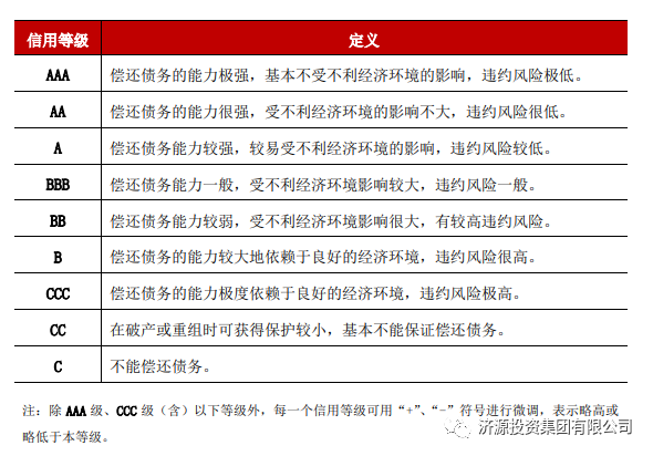 主體信用評級是以企業(yè)或經(jīng)濟(jì)主體為對象進(jìn)行的信用評級,主要分為三等九級,,符號表示分別為 AAA、AA、A、BBB、BB、B、CCC、CC、C,其中除 AAA 級、CCC 級(含)以下等級外,每一個信用等級可‘+’或‘-’符號進(jìn)行微調(diào),表示略高或略低于本等級。AA+等級僅次于AAA,表明企業(yè)償還債務(wù)的能力很強(qiáng),受不利經(jīng)濟(jì)環(huán)境的影響較小,違約風(fēng)險很低。
