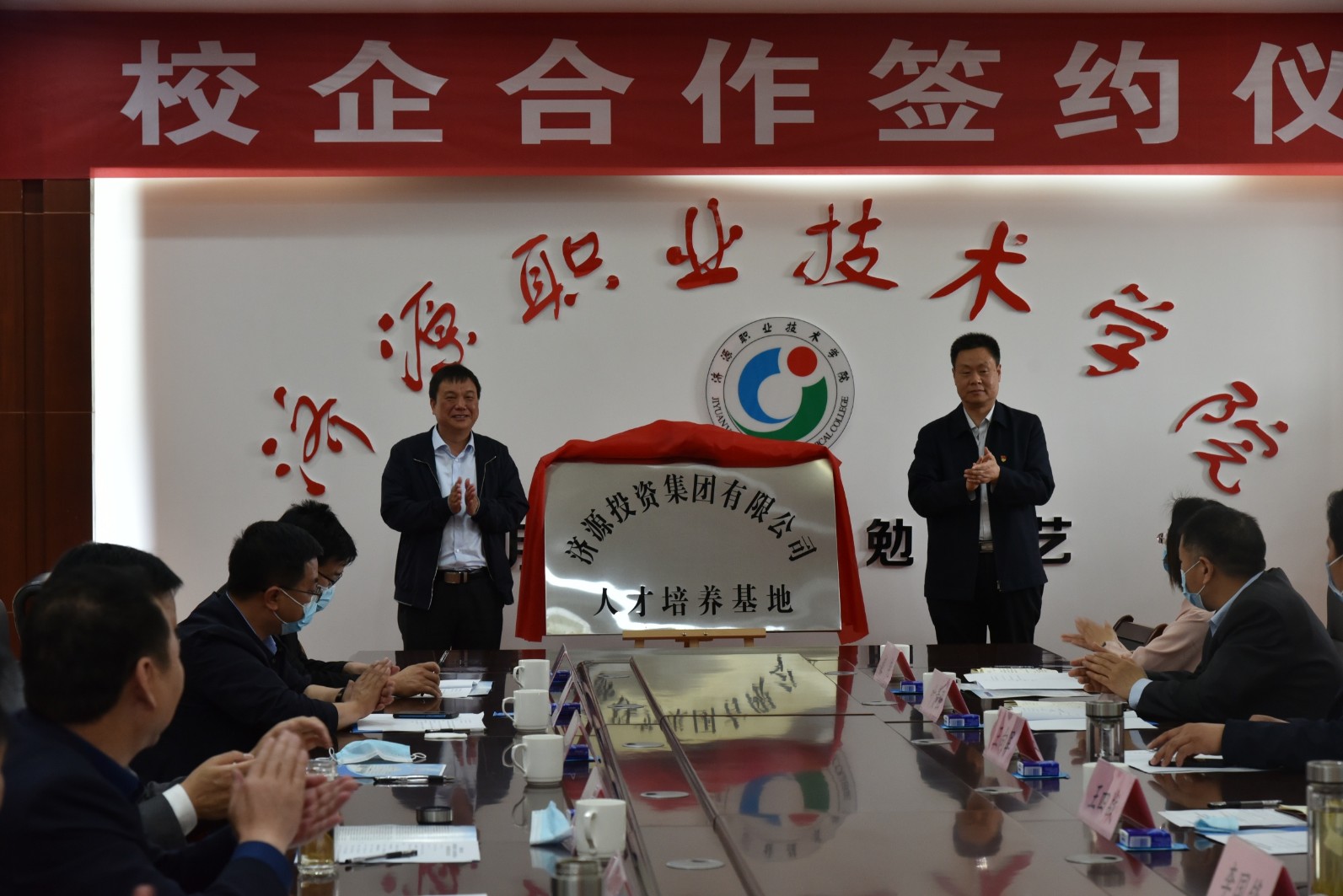 集團(tuán)公司黨委書(shū)記、董事長(zhǎng)陳明亮與濟(jì)源職業(yè)技術(shù)學(xué)院黨委書(shū)記王四戰(zhàn)為“濟(jì)源市投資集團(tuán)有限公司人才培養(yǎng)基地”揭牌。