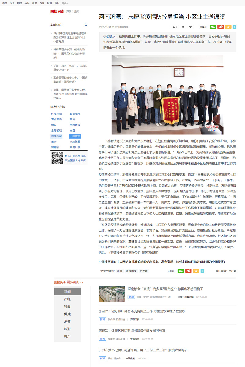 中國(guó)搜索:河南濟(jì)源志愿者疫情防控勇?lián)?dāng) 小區(qū)業(yè)主送錦旗