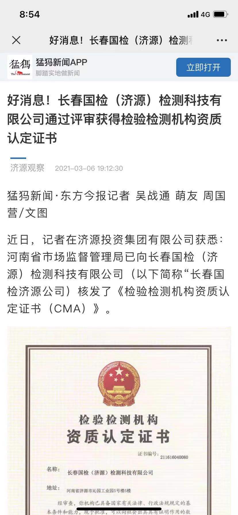 2021年3月1日,河南省市場(chǎng)監(jiān)督管理局向長(zhǎng)春國(guó)檢(濟(jì)源)檢測(cè)科技有限公司(以下簡(jiǎn)稱“長(zhǎng)春國(guó)檢濟(jì)源公司)核發(fā)了《檢驗(yàn)檢測(cè)機(jī)構(gòu)資質(zhì)認(rèn)定證書(CMA)》。該證書的取得,標(biāo)志著該公司已具備國(guó)家有關(guān)法律、行政法規(guī)規(guī)定的基本條件和能力,可以向社會(huì)出具具有證明作用的數(shù)據(jù)和結(jié)果。